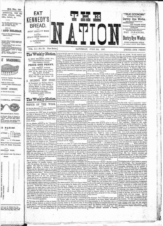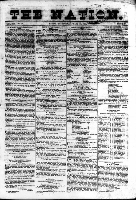 Geography Publications, 1995.; Murphy, "British Association meeting of 1857".; Murphy, Ireland: a social, cultural and literary history.; NLI; [IBL?] 31:5 (1951), pp. 98-100.; Newsinger, Fenianism, p.16.; Nic Congail, Riona. "Young Ireland and the Nation." Éire-Ireland. 46:3&4 (2011), pp. 37-62.; Norman, Catholic Church and Ireland.; Novak, Rose. "Reviving 'Eva' of The Nation?: Eva O’Doherty’s Young Ireland Newspaper Poetry." VPR. Toronto: University of Toronto Press, 45:4, Winter 2012, pp.436-465.; Nowlan, "Duffy and the Repeal Movement"; O'Broin, Leon, Charles Gavan Duffy: Patriot and Statesman, 1967.; O'Donoghue. Poets of Ireland, 1902, pp.40, 161.; Ó Súilleabháin. Longford Authors. p.105.; O'Toole, "The Women Writers of 'The Nation'." Thomas Davis and Young Ireland. pp.119-122; Newspaper Book.; Penet, "Heart of the Nation".; Penet, "Nation and the Irish Language".; Platt, Len. Joyce and the Anglo-Irish, 1998. pp.68-69.; Rafter, Irish Journalism Before Independence.; Ryan, Irish Literary Revival.; Ryder, "Davis, Thomas." DNCJ, p.162.; Ryder, "Young Ireland." DNCJ, p.695.; "The Nation." Wikipedia.; Tilley, "Periodicals in Ireland" p.210.; Tilley, "Wilde, Jane." DNCJ, p.676.; "Tim Healy (politician)." Wikipedia.; Yeates, "Life and Career of William Martin Murphy".